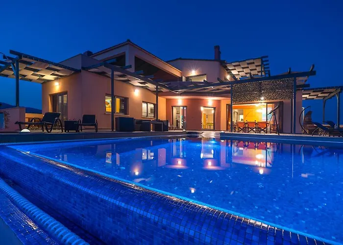La Skinos Ilivatos Eco Villa&Estate comprende una cucina dotata di un bollitore elettrico, un frigo e una vetreria per la preparazione dei pasti. L'aeroporto di Cefalonia Anna Pollatou dista 55 km da questa villa con 5 camere da letto. La villa offre una piscina, biciclette.